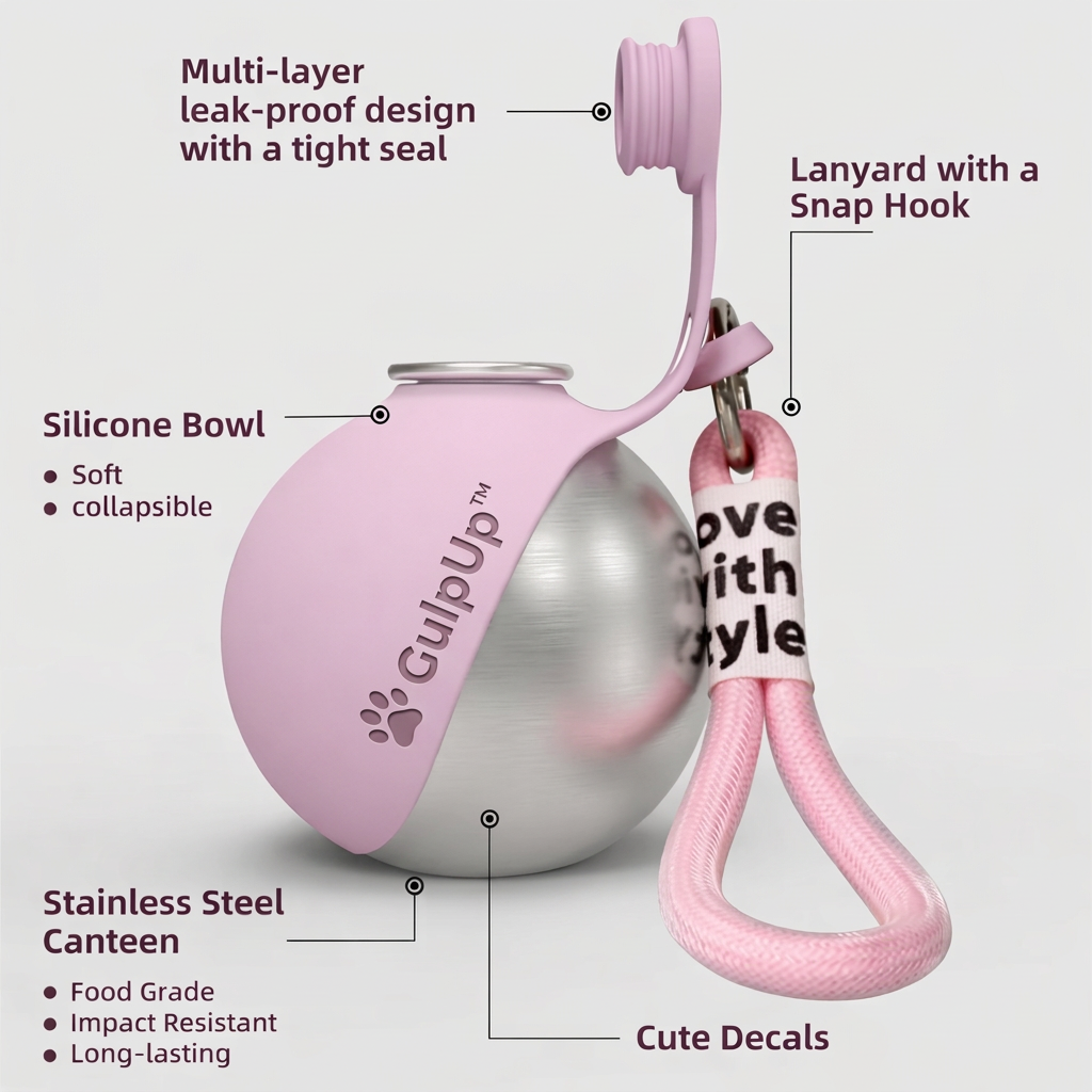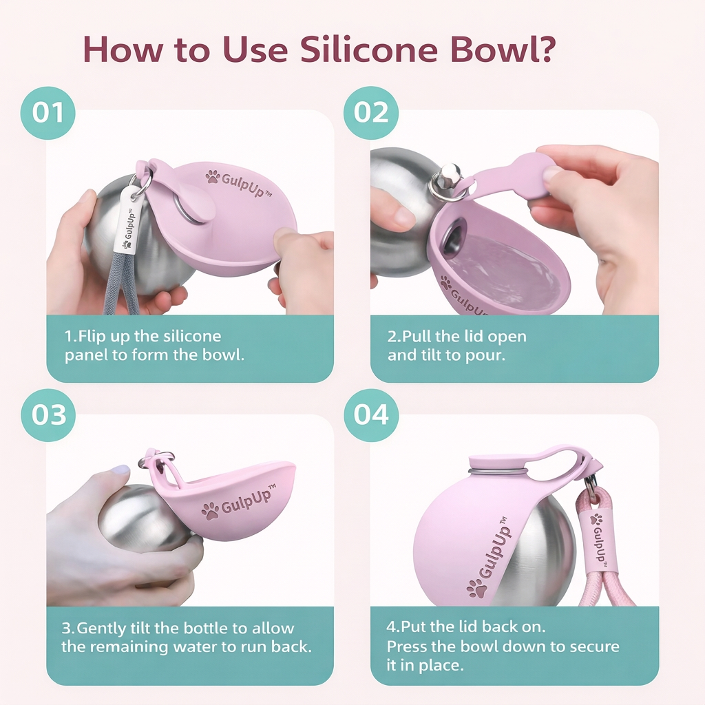 No bowl. No second bag. No excuses. Just GulpUp™ clipped to your bag.